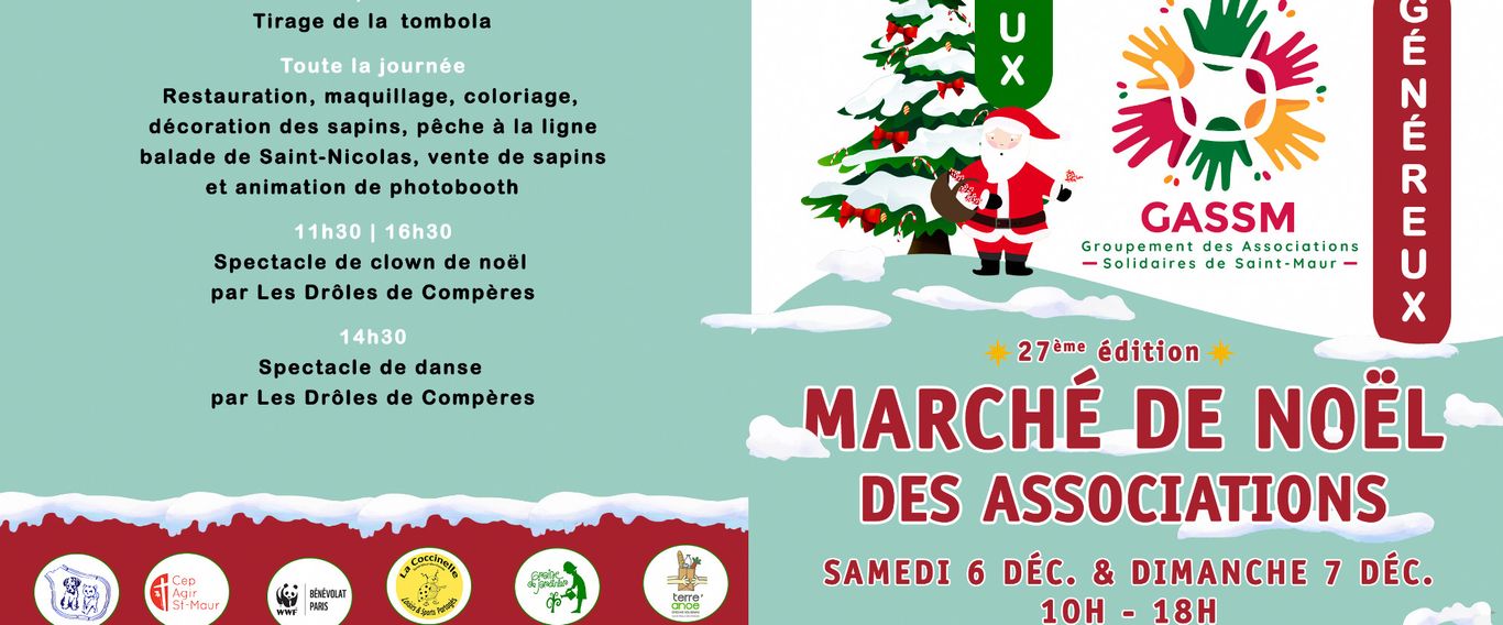 Le marché de Noël des associations solidaire de Saint-Maur existe depuis plus de 25 ans. Il permet de financer des projets de solidarité initiés par des associations saintmauriennes. Il est entièrement tenu par des bénévoles d'une vingtaine d'associations de solidarité. Il est organisé par le Groupement des associations solidaires de Saint-Maur (GASSM). Graine de Jardinier participe à ce marché depuis 2014. Plus dans le coin des amis.